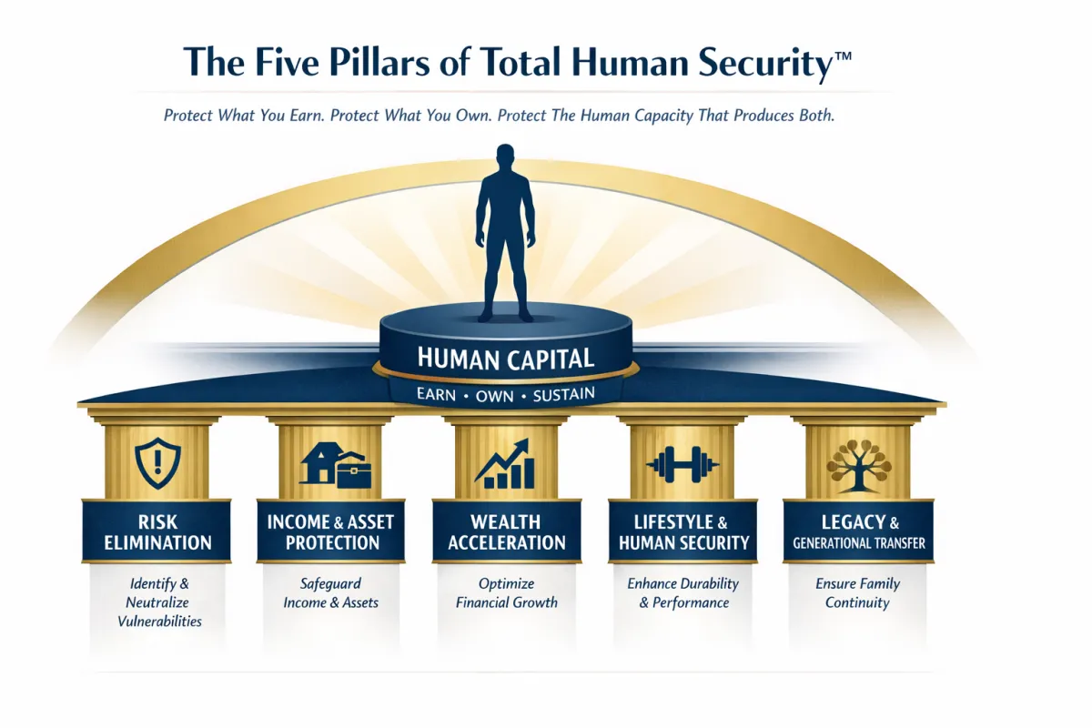 His Total Human Security™ methodology integrates advanced protection strategy, wealth coordination, and human performance awareness into one unified framework designed for modern high earners.
